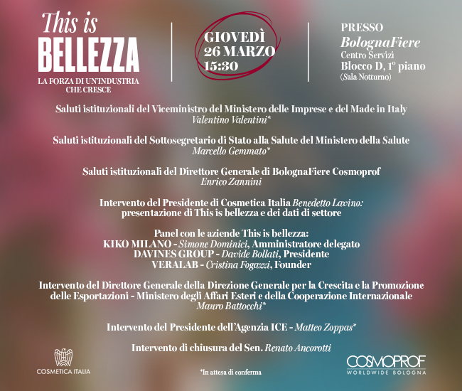 Un appuntamento imperdibile per scoprire il posizionamento strategico e i tratti distintivi del beauty italiano. L'evento sarà anche l’occasione per conoscere il valore del settore cosmetico attraverso la presentazione dei dati outlook (fatturato, export, consumi) e i principali trend di sviluppo per le aziende.